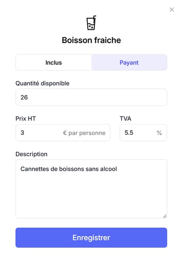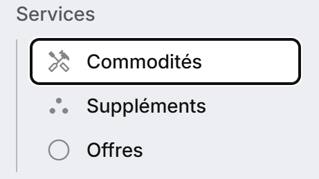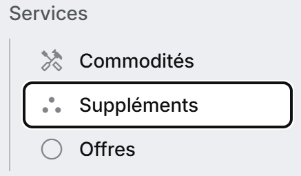 Les services payants (ex. : restauration, matériel, accès VIP…) se paramètrent dans le menu “Suppléments” de votre espace de travail.