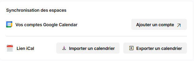 En bas de la page, connectez votre agenda Google, importez votre calendrier, ou reliez votre calendier OfficeRiders à celui d’Airbnb ou d’une plateforme similaire via l’exportation de liens iCal.