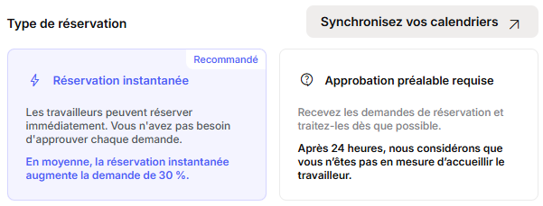 ATTENTION : Avoir votre espace en réservation instantanée sur une catégorie implique que votre calendrier soit à jour. Pour rappel, vous pouvez mettre à jour manuellement votre calendrier dans vos Fermetures, ou de façon automatique via la synchronisation de calendriers.